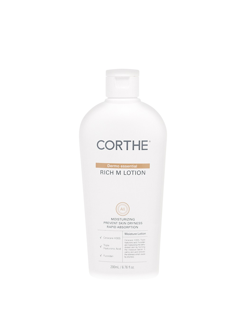 The Corthe Dermo Essential Rich M Lotion is a lightweight yet deeply nourishing moisturizer designed to replenish hydration and reinforce the skin’s natural barrier. Formulated with Ceracare H30S, a pre-liposome containing 30% human skin-identical ceramides, it effectively restores the skin’s ceramide levels, enhancing moisture retention and resilience.